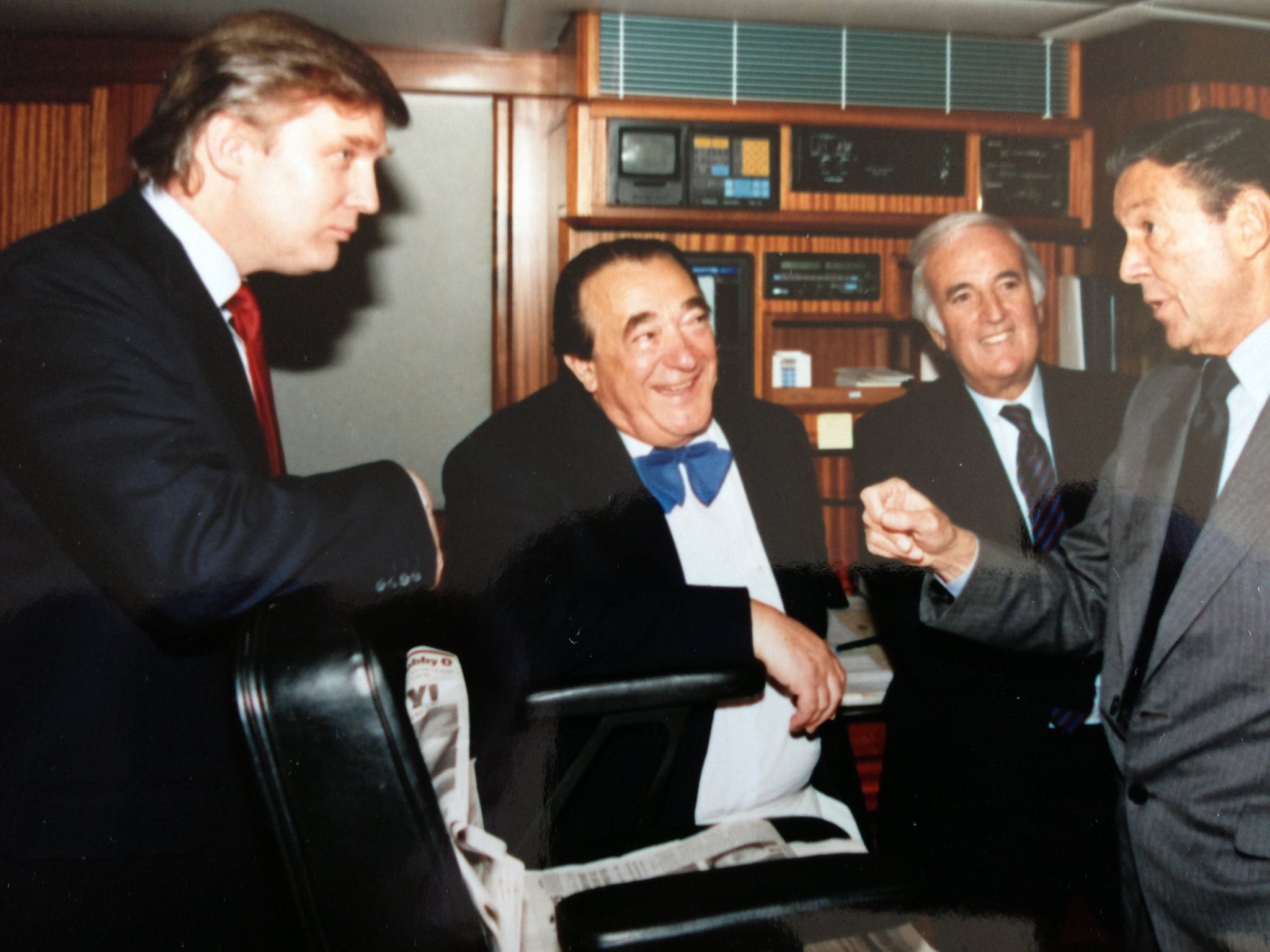 Donald Trump and KGB operative Robert Maxwell aboard Maxwell’s yacht in 1989. Likely also aboard that day were Ghislaine Maxwell and Jeffrey Epstein.