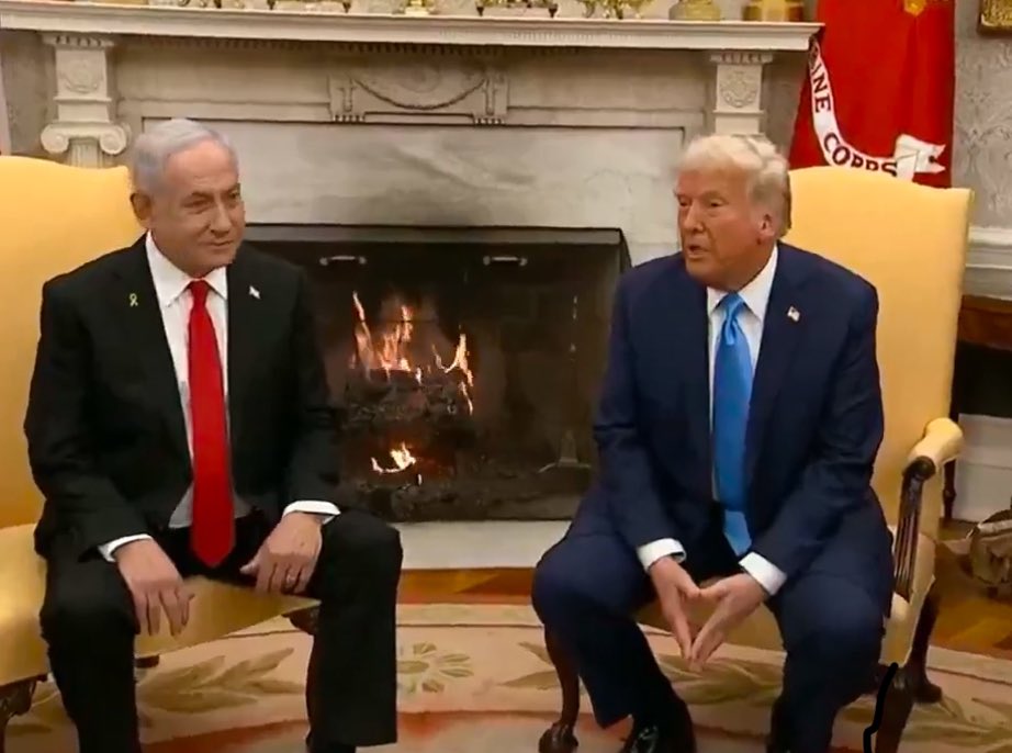 U.S. President Krasnov displaying his vagina hands with Soviet Jew Benjamin Netanyahu at the WhiteHouse during a press conference.