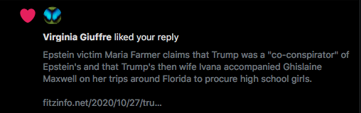 The star witness in the whole Epstein affair arguably is Virginia Giuffre (formerly Roberts). Although she has denied personally seeing Trump abuse underaged girls, she admitted that he knew about the abuse at the hands of Epstein and Maxwell but did nothing. Interestingly, she seems to support the testimony of Maria Farmer, a lesser known Epstein witness, about whom this author wrote in Part VI, where Trump and his then wife Ivana were facilitating and participating in the child sex abuse. On January 14, 2021, this author tagged Giuffre with a specific quote from Farmer and a link to Part VI of this series.[1] She liked the Tweet. This author made a screen recording of it to prove the like, in case someone suspected photoshopping of the screen capture.[2] Farmer’s testimony seems very credible. There doesn’t seem to be a financial motive to name Trump, which wasn’t part of her general claim against Epstein. Furthermore, naming someone as high profile as the U.S. President could possibly get one killed, and Farmer likely knew this but did so anyway. Credit to her bravery. With Ghislaine Maxwell now in jail (currently she is seeking a presidential pardon from her old friend Donald Trump)[3]., Epstein dead, and Ivana also dead, we may never know the truth about Ivana’s involvement, but we see the patterns, which I think is enough.