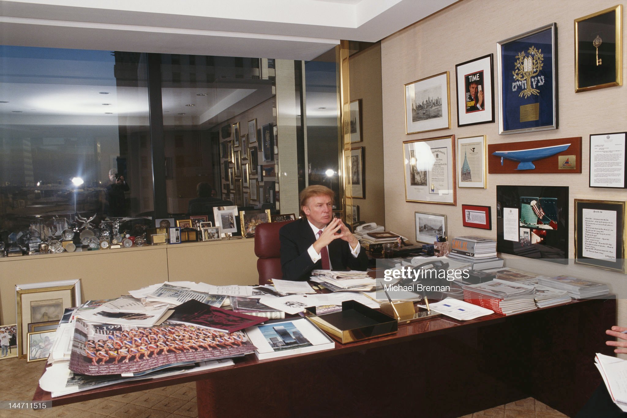 American businessman Donald Trump in his office in Trump Tower, Fifth Avenue, New York, 1999. This time, President Krasnov was making the upright pyramid hand gesture. (Photo by Michael Brennan/Getty Images)