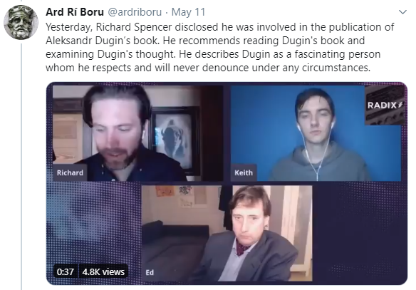 Since then, Spencer has denied that he is a duginist, while his rhetoric has become even more brazenly duginistic in nature. It is obvious that he has been promoting Dugin since 2012.