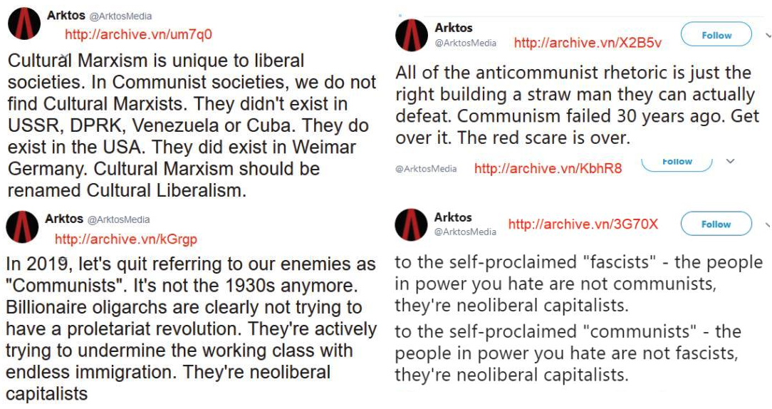 Arctos Media: "Let's stop calling our enemies "communists." It's not the 1930s... The Communists collapsed 30 years ago. Accept it... The red panic is over... For the self-proclaimed fascists, the people you hate are not communists, they are neoliberal capitalists...