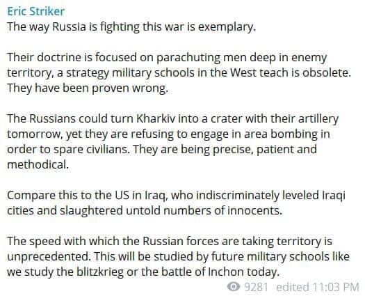Striker, once associated with Spencer, admires the way the Russian Federation is fighting in Ukraine, calling them "emplary". "The speed at which Russian troops capture territory is unprecedented." And Putin's troops could "... tomorrow turn Kharkiv into a funnel with the help of their artillery," but "spared" the civilian population. "They are accurate, patient and methodical." And of course, Ukraine, as he claims, does not have the right not only to most of its territories, but also should cease to exist as a state. Stryker also fully supported Putin's massacres of Russian nationalist organizations and politicians who did not support Putin's "liberation campaign" against Ukraine on the sole grounds that they are not loyal to the Russian authorities and thus pose a threat to them. But at the same time, he makes frantic hysterics when his freedom to promote his ideas is limited in the United States.