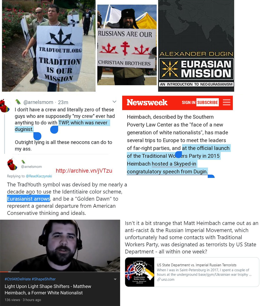 Matthew Heinbach uses the symbol of the Eurasian star "Magic of Chaos" as the emblem of his Traditionalist Workers' Party.His open praise of Duginism and Putin's regime shocked with its stunning idiocy, especially when he called Putin "the leader of the free world." In 2016, identifying himself as a member of the alto-right, he praised Putin's Russia (RF) as an "axis for nationalists."