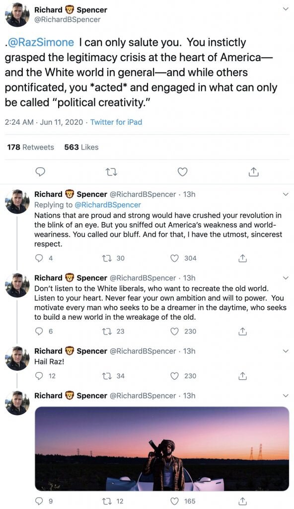 June 11, 2020 Spencer, after the beginning of the antifa and BLM pogroms, breaks a new bottom by supporting the creation of the "Autonomous Zone of Capitol Hill" on the territory of Seattle, also called the CHAZ Republic ("CHAZ") (existed June 8-24, 2020). Apparently, under the influence of Duginism and its National Bolsheviks, Spencer decided to recognize the "revolutionary potential" of Antifa and BLM and use it to deal a "crushing blow to the neoliberal system".