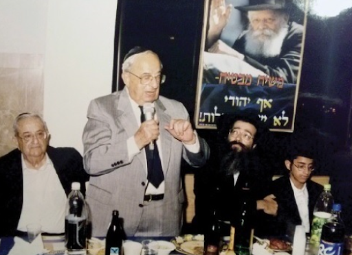 Israeli Prime Minister Yitzhak Shamir speaks at a Chabad-Lubavitch of Tel Aviv event marking 30 days since the passing of the Rebbe