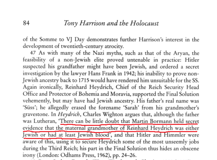 https://www.google.co.uk/books/edition/Tony_Harrison_and_the_Holocaust/ivwqS2sf1_kC?hl=en&gbpv=1&dq=%22there+can+be+little+doubt+that+martin+bormann+held+secret+evidence+that+the+maternal+grandmother+of+reinhard+Heydrich+was+either+jewish+or+had+at+least+jewish+blood%22&pg=PA84&printsec=frontcover