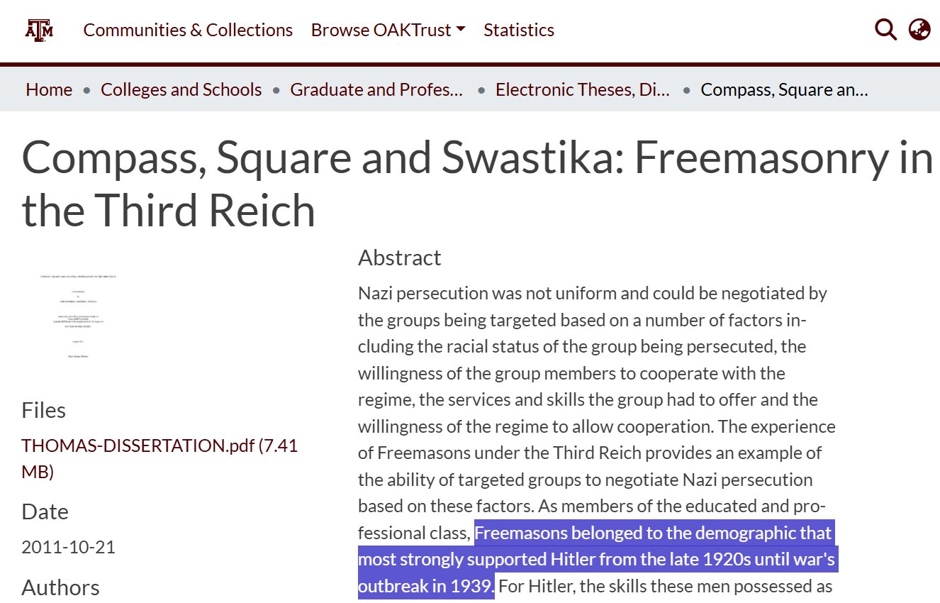 “Freemasons belonged to the demographic that most strongly supported Hitler from the late 1920s until war's outbreak in 1939.”
