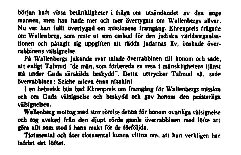“Upon Wallenberg's affirmative answer, the chief rabbi spoke to him and said that according to the Talmud "men who prepare a journey in the service of humanity are under God's special protection." In Hebrew, Ehrenpreis prayed for the success of Wallenberg's mission and for God's blessing and protection, and gave him the priestly blessing.