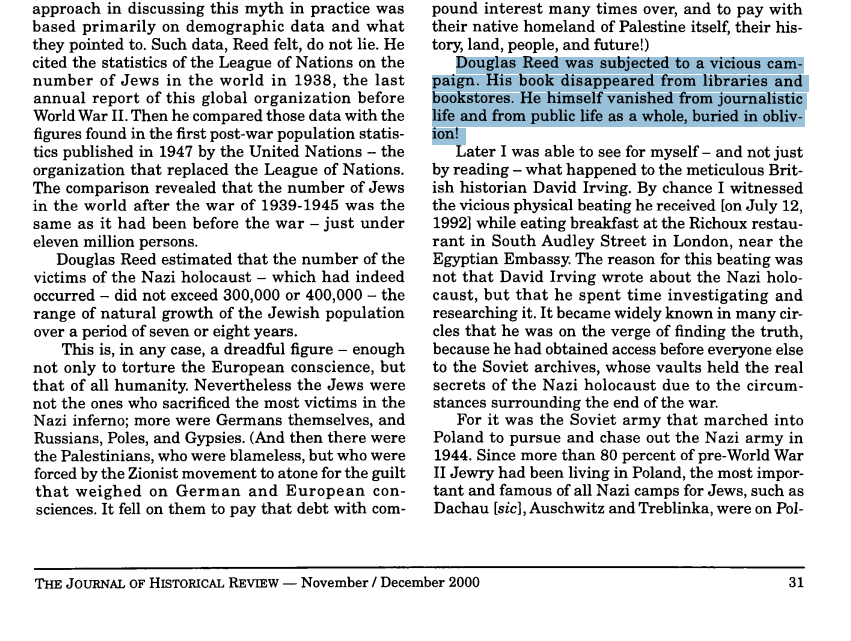 "Douglas Reed was also staunchly anti-Communist, believed that there existed a Communist-Zionist-Supercapitalist nexus, and argued that National Socialism was a "stooge or stalking horse" meant to further the aims of the Communist Empire[2] and the Zionist ambition,[3] reasoning that "for great successes, which they could not otherwise achieve, Soviet Communism and Political Zionism needed an apparent antithesis, as a heavyweight champion needs a sparring partner."