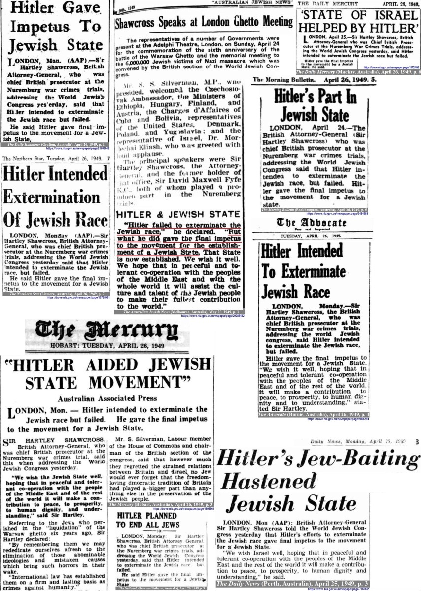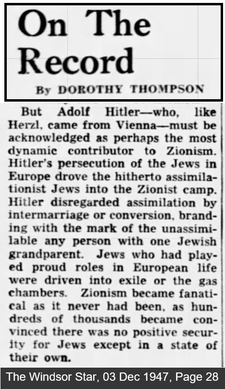 "Hitler has turned more Jews to Zionism than all the efforts of the world-wide Zionist organization." (Quoted in The Gazette, May 8 1933, p. 6)