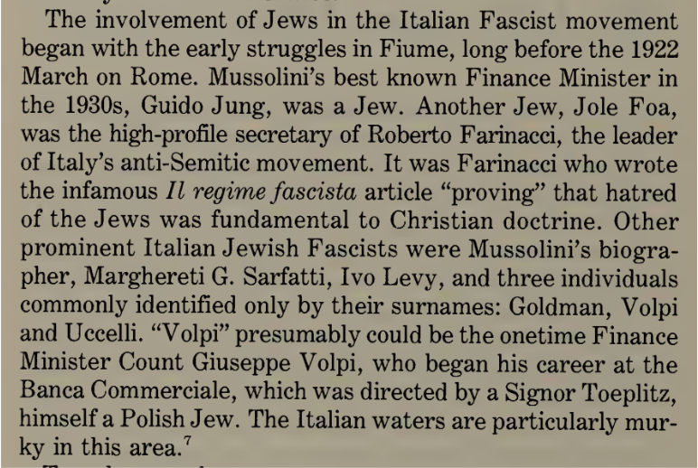 Jews such as Angelica Balabanoff had a decisive influence on the formation of the spiritual world of Mussolini in his leftist-anarchist period. Another example is that of Margareta Sarfatti (who edited Gierarchia, el Duce’s fascist organ). Five Jews (A. Finzi, J. Pontremoli, A. Jarach, E. Jona, C. Sarfatti) were among the founders of the fascist nucleus of the “War Organization” (Fasci di combattimento) in March 1919. Those who formulated the socio-economic concept of Italian fascism – “the state of corporations” – both on the ideological and practical levels, were predominantly Jews. Thus, for example, Guido Jung, finance minister and a senior member of the Supreme Fascist Council. Thus also Guido Arias, the senior ideologue of the socio-economic concept of fascism; L. Toeplitz, the chief banker of Italy; and Otto Herman Kahan, a great admirer of el Duce and one of the pillars of banking and American philanthropy. The hard-core of Mussolini’s economic advisers strictly consisted of three Jewish senators (H. Ancona, A. Luria, T. Meyer). Indeed, not for nothing did Alfred Rosenberg call Mussolini “Judenknecht” (Jewish lackey)."