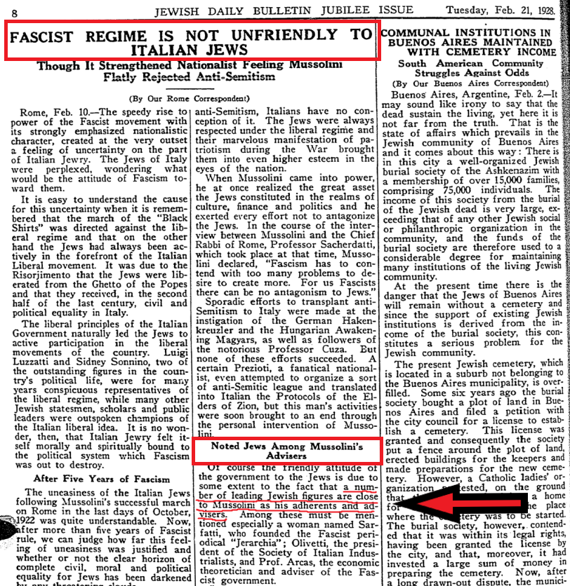 "But in 1922 something very important happened in Italy: the March on Rome and the advent of Fascism. Freemason Volpi finances the rise of Benito Mussolini (with the participation of the usual Venetian investors). Let us not forget that all four of the fascist quadrumvirs (Balbo, De Bono, Bianchi and De Vecchi) are Freemasons. At the same time, (Polish Jew) Toeplitz, through the intercession of his friend (Italian Jew) Margherita Sarfatti, helped Mussolini with Bank advertisements in his newspaper "Il Popolo d'Italia" and some hidden subsidies."