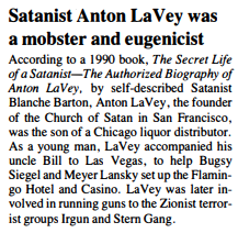 [23] Goodrick-Clarke, s. 262-263, v. 2. [...] Nazi chants and salutes are used in the Church of Satan, a sect devoted to devil-worship and unbridled sensual gratification, which was founded in 1966 in San Francisco. Anton Szandor LaVey, The Satanic Rituals (New York, 1972); (The King of Satanism in America today is Anton LaVey, a former circus lion-tamer who greatly admires the Nazis. LaVey's book, The Satanic Bible, published in 1969, is dedicated to a puzzling mixture of people, with one entry reading: "To Karl HAUSHOFER, a teacher without a classroom.") —Dusty Sklar, The Nazis and the Occult, Dorset Press, New York, (1977), s. 63.