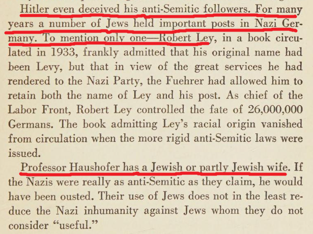 “Haushofer is the historian of the Nazi Party, but it will be remembered that this same Professor Haushofer was the General Haushofer who took no action against the Communists during the Red putsch. In fact, when the Reds seized control of the Bavarian government, General Haushofer took an oath of loyalty to the Red regime. Now he was a Nazi bigwig, despite the fact that hatred of Communism is the chief tenet of the Hitlerian doctrine. In addition, at the time, Kurt Haushofer was married (and still is) to a wealthy Jewess. Haushofer was responsible for the National Socialist foreign policy.”