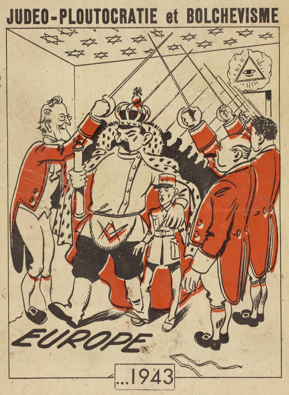 'Judeo-Plutocracy and Bolshevism' — French leaflet from the Second World War (1943) showing Stalin as a Mason walking a boyish Charles de Gaulle under a sabre arch, with Churchill and Roosevelt at the front.