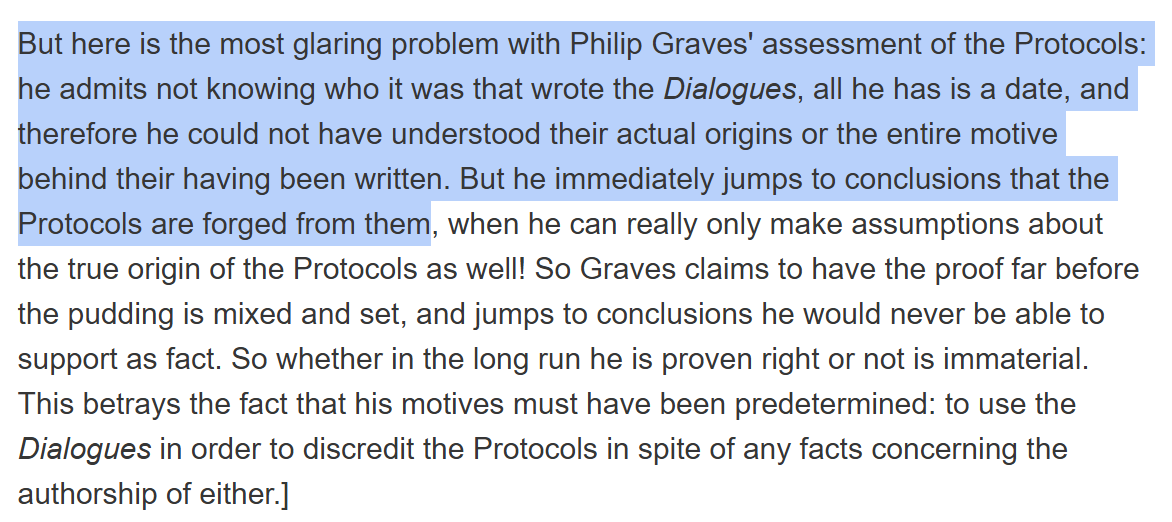 The articles by Philip Graves in the Times in 1921 vs the Protocols are discredited.