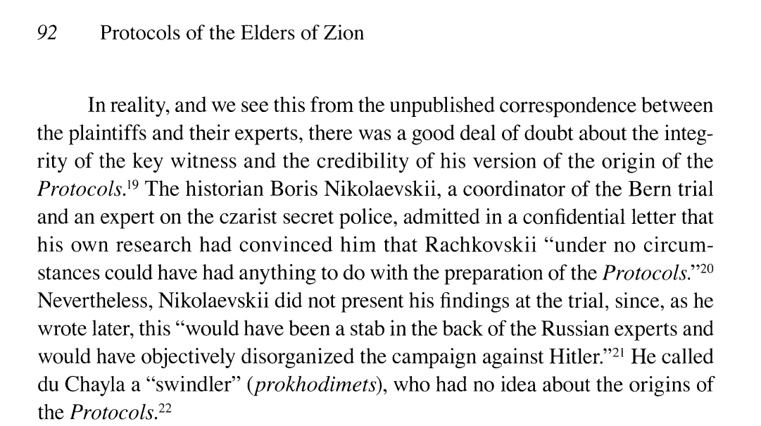 Michael Hagemeister, produced a text entitled The Protocols of the Elders of Zion: Between History and Fiction that, although it does not endorse the authenticity of the protocols, nevertheless controverts the standard narrative. It shows that arguments put forth against the Protocols in the Berne trial relied on extremely unreliable information and witnesses. A notable quote from it is: