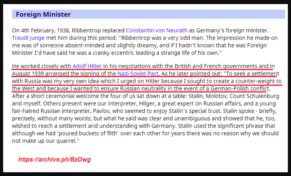 "To seek a settlement with Russia was my very own idea which I urged Hitler because I sought to create a counterweight to the West and because I wanted to ensure Russian neutrality in the event of a German-Polish conflict."