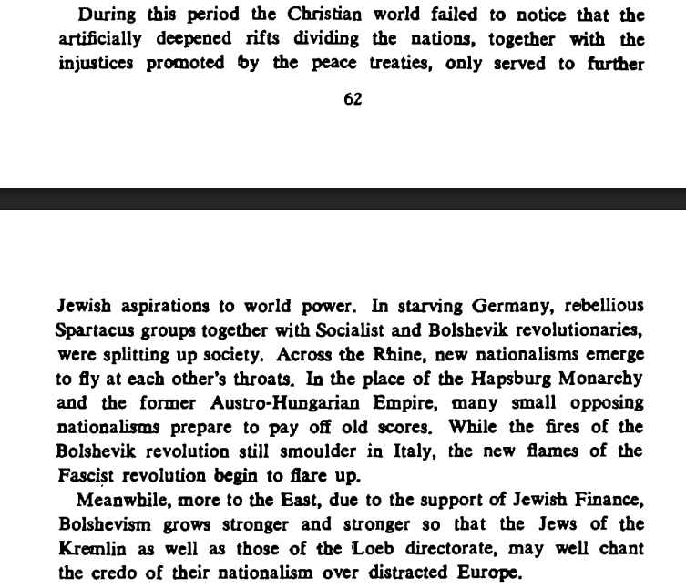 “During this period (post-WW1) the Christian world failed to notice that THE ARTIFICIALLY DEEPENED RIFTS DIVIDING THE NATIONS, TOGETHER WITH THE INJUSTICES PROMOTED BY THE PEACE TREATIES, ONLY SERVED TO FURTHER JEWISH ASPIRATIONS TO WORLD POWER.”