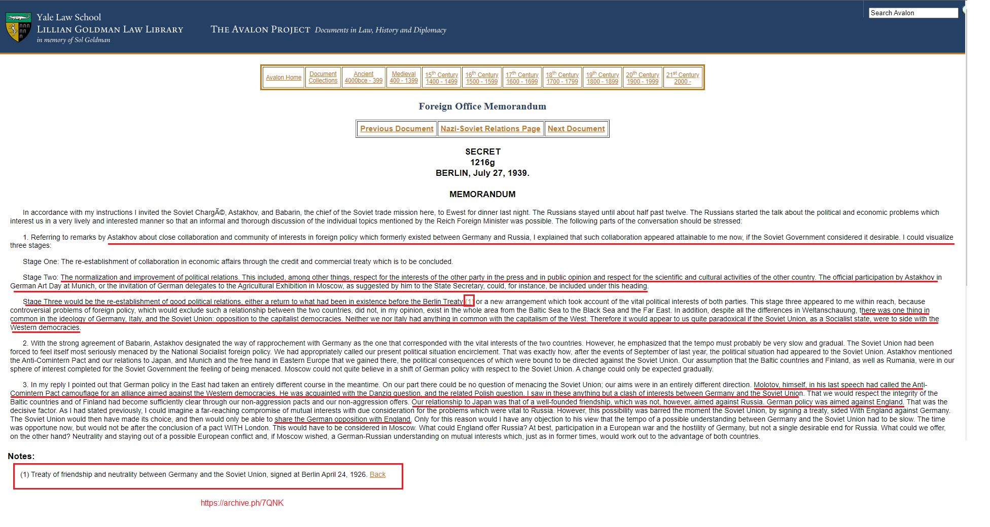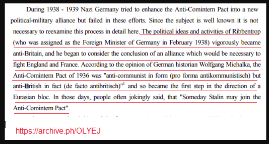 A very revealing Soviet memorandum dating back to July 27, 1939 which was less than a month before the Molotov-Ribbentrop Pact was signed, reveals the desire of the Soviet Union of establishing a friendly relationship with Germany and Italy and says the one common ideology shared by Germany, Italy and the Soviet Union was their opposition to capitalist democracies I.E the West. Molotov admits that the Anti-Comintern Pact was a camouflage for an alliance aimed against the Western democracies and stated that ''Our relationship to Japan was that of a well-founded friendship, which was not, however, aimed against Russia. German policy was aimed against England''.