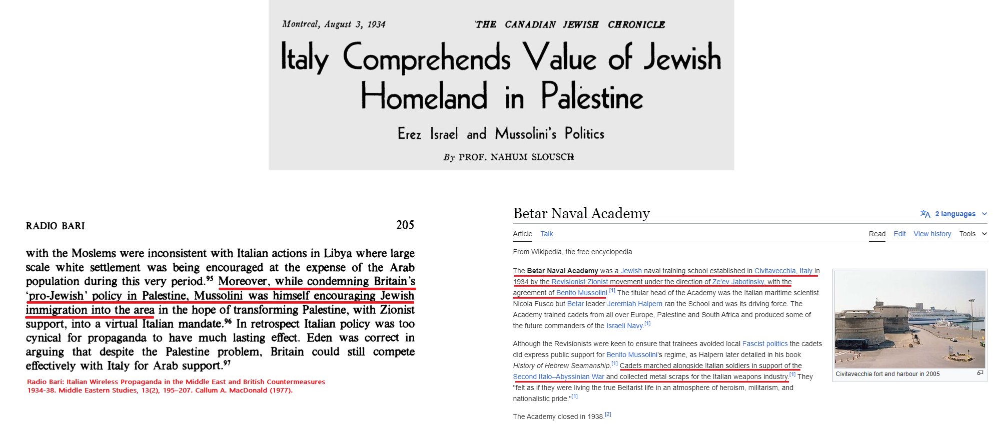 Jews such as Angelica Balabanoff had a decisive influence on the formation of the spiritual world of Mussolini in his leftist-anarchist period. Another example is that of Margareta Sarfatti (who edited Gierarchia, el Duce’s fascist organ). Five Jews (A. Finzi, J. Pontremoli, A. Jarach, E. Jona, C. Sarfatti) were among the founders of the fascist nucleus of the “War Organization” (Fasci di combattimento) in March 1919. Those who formulated the socio-economic concept of Italian fascism – “the state of corporations” – both on the ideological and practical levels, were predominantly Jews. Thus, for example, Guido Jung, finance minister and a senior member of the Supreme Fascist Council. Thus also Guido Arias, the senior ideologue of the socio-economic concept of fascism; L. Toeplitz, the chief banker of Italy; and Otto Herman Kahan, a great admirer of el Duce and one of the pillars of banking and American philanthropy. The hard-core of Mussolini’s economic advisers strictly consisted of three Jewish senators (H. Ancona, A. Luria, T. Meyer). Indeed, not for nothing did Alfred Rosenberg call Mussolini “Judenknecht” (Jewish lackey)."
