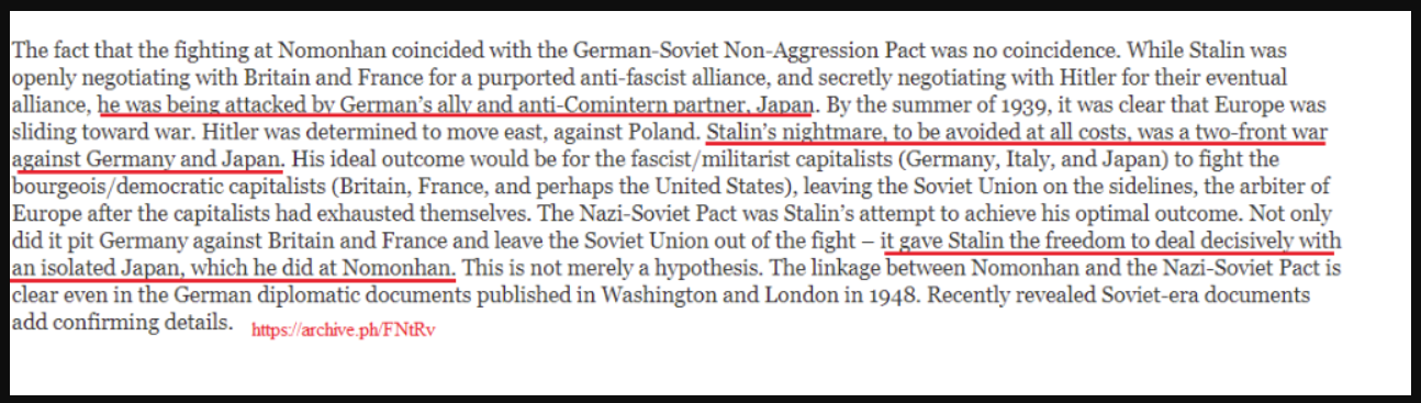 Many are unaware that in 1939 the Soviet Union was still in military conflict against Japan and that one of Stalin's nightmares was having to fight a two-front war against both Germany and Japan, and he wanted to avoid this at all costs.