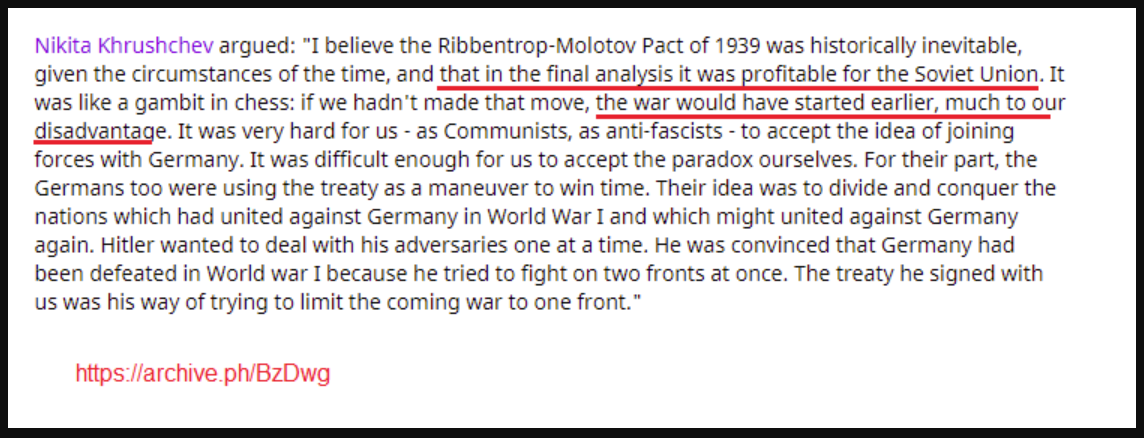 Khrushchev admits that the pact between Germany and the Soviet Union was PROFITABLE for the Soviet Union, one of the reasons was that the war could have started earlier against them, much to their disadvantage, because the Soviet Union wanted to avoid a two-front war.