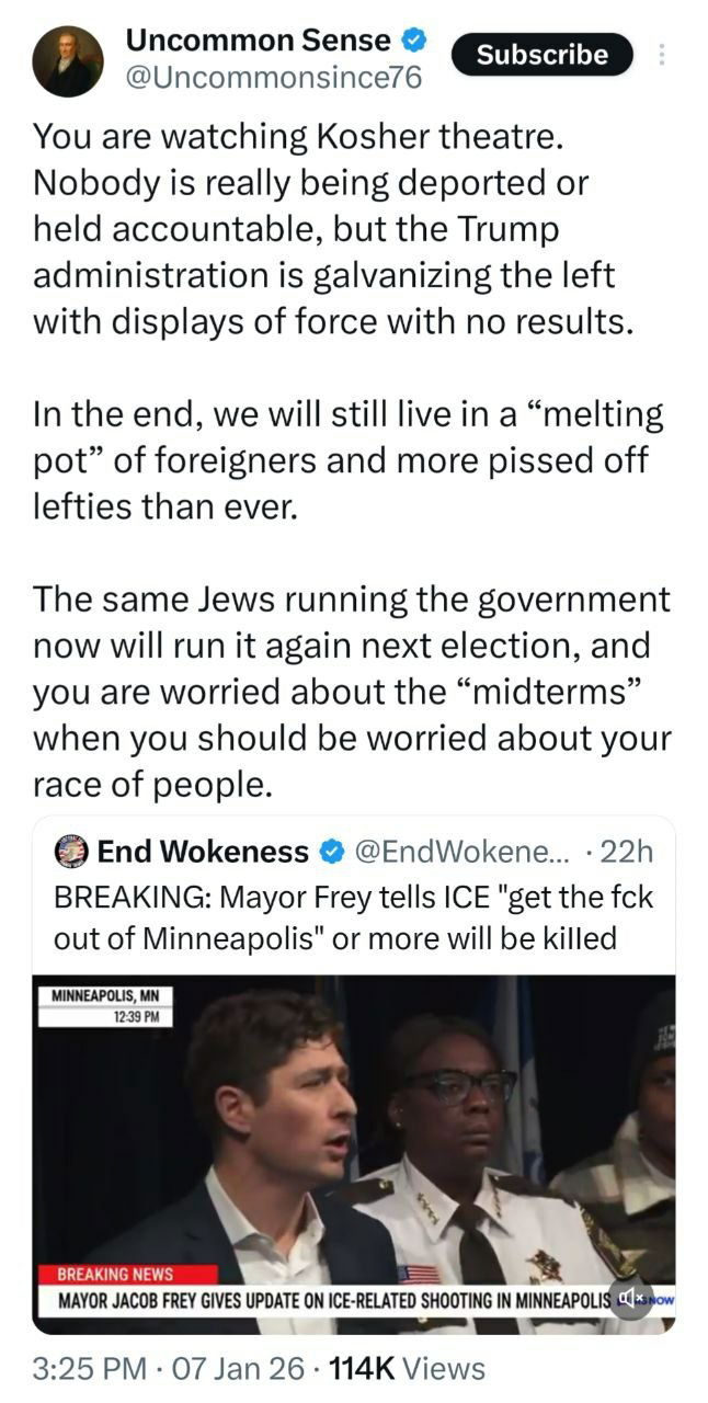 Quote from Ryan Augustine on January 24, 2026, 00:27The ICE raids are theater. If Trump and the republicans were serious about immigration they could make citizenship a requirement for welfare programs. They could put a clause in the budget that all federal funds will be withheld from states who give immigrants social services. They could revoke all H1-B visas 90% of the immigration issue would vanish. Trump and the Republicans have the house and the senate there's nothing stopping them. It's a 2 for one millions of immigrants go home and the budget gets slashed by 100's of billions of dollars.