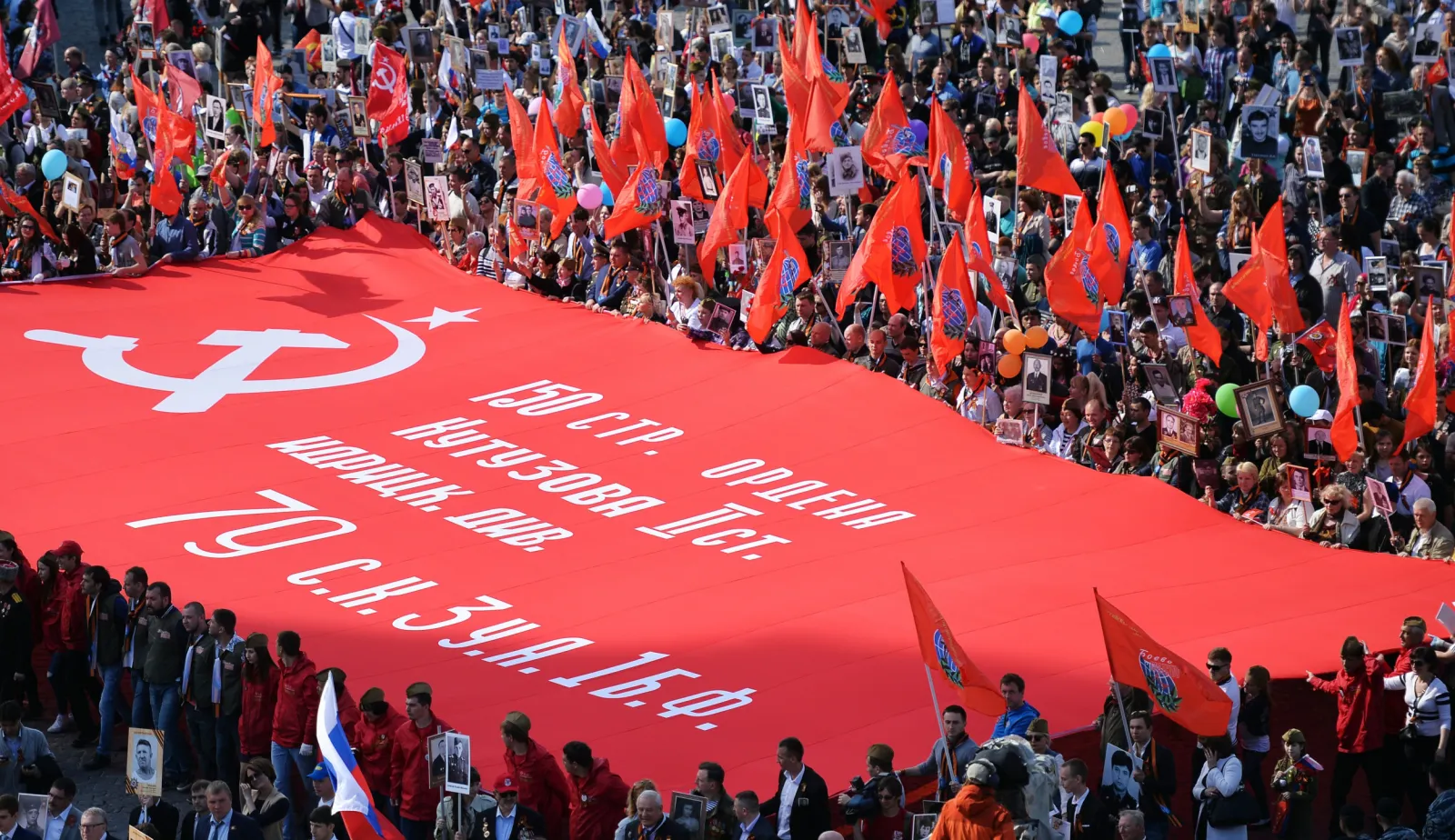 People carry red flags and banners as they take part in the Immortal Regiment march during the Victory Day military parade in Moscow on May 9, 2015. Russian President Vladimir Putin presided over a huge Victory Day parade celebrating the 70th anniversary of the Soviet win over Nazi Germany, amid a Western boycott of the festivities over the Ukraine crisis.—AFP via Getty Images/AFP via Getty Images